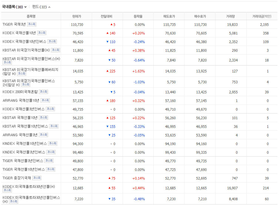 검토일 기준 금리가 올라가는 시점이기 때문에 채권의 가격이 내려가는 시점이라 포트폴리오 구성측면에서 올웨더를 고려하신다면 검토할 만한 게 국채이지만, 한국채보단 미국채의 인기가 더 많습니다.
