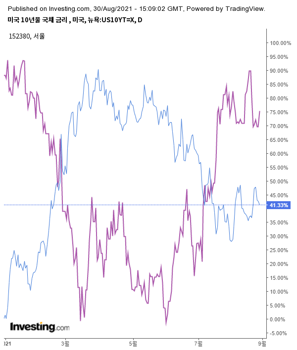 금리가 오르면 국채는 내리는 상관관계 그래프 입니다.