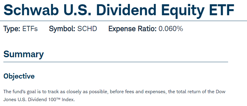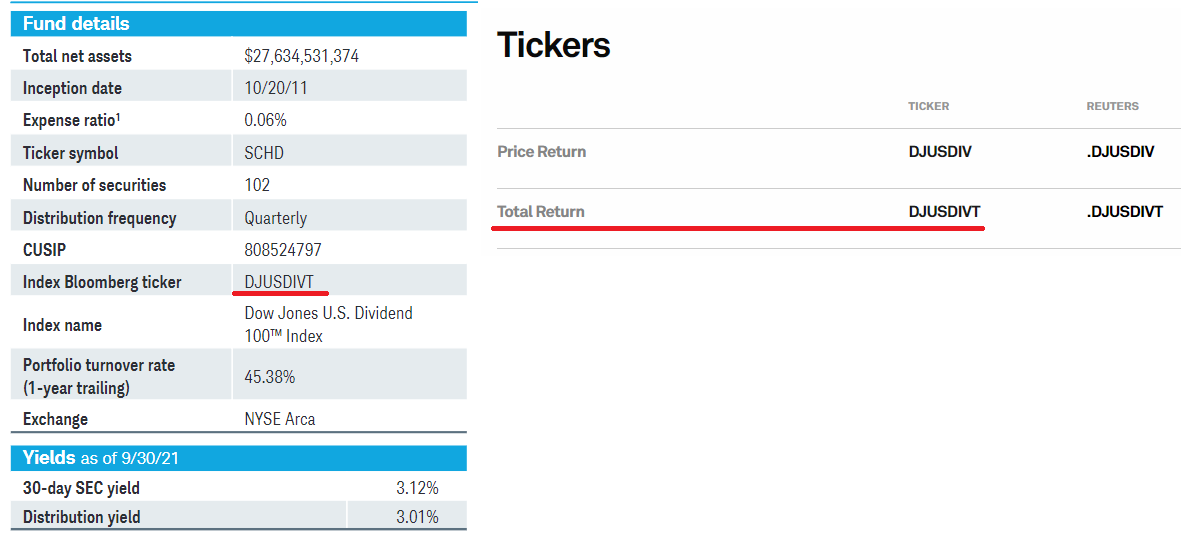SCHD는 투자설명서에 지수티커를 DJUSDIVT로 명시하고 있으며, 지수산출 기관의 S&P를 보면 DJUSDIVT는 Dow Jones U.S. Dividend 100 Total Return 를 나타냅니다.