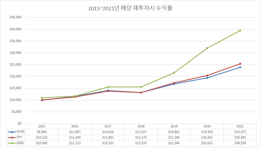 2015년 10,000달러로 SCHD, SPY, QQQ 배당 재투자시 수익률 입니다. SPY와 SCHD의 차이가 근소하게 좁혀진 걸 볼 수 있습니다.