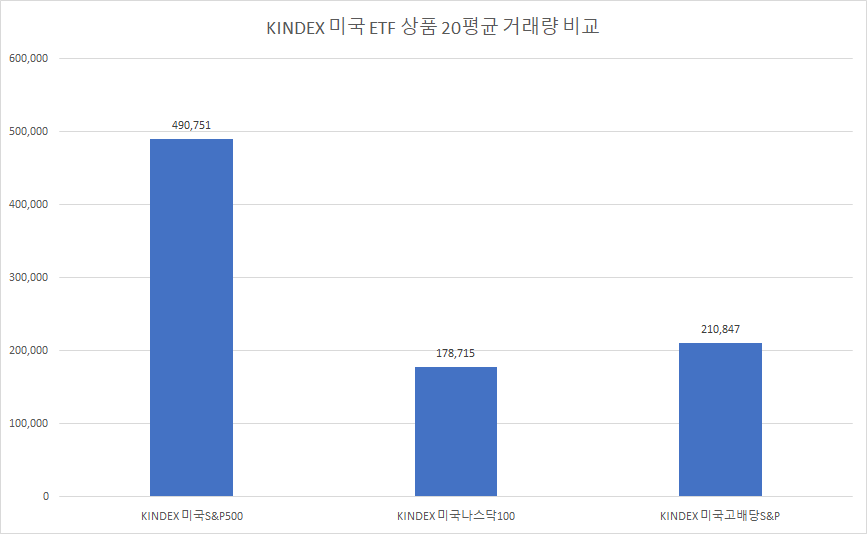 KINDEX 에서 운영 중인 미국 S&P 500, 미국 나스닥 100에 비해 그렇게 뒤쳐지는 거래량이 아닙니다.