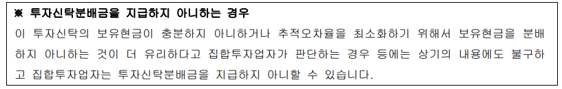 | 분배금 지급기준일 | 1,4,7,10월의 마지막영업일, 회계기간종료일 | 3, 6, 9, 12월 지급 |