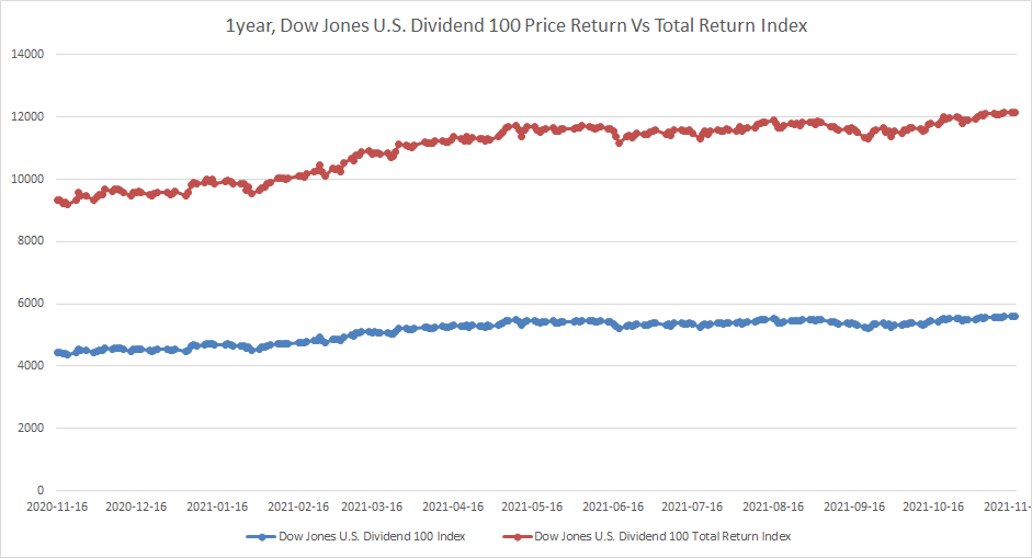 하지만, 이 차이는 꽤 큰 편입니다. 10year, Dow Jones U.S. Dividend 100 Price Return Vs Total Return Index