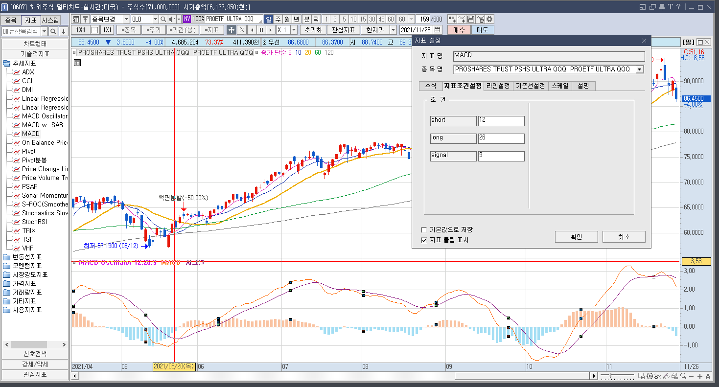 기본값: 12일(단기), 26일(장기), 9일(Signal)