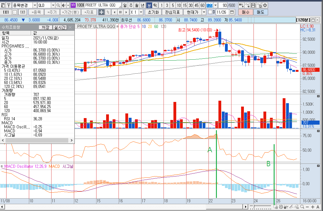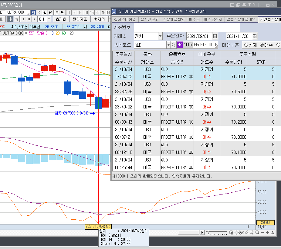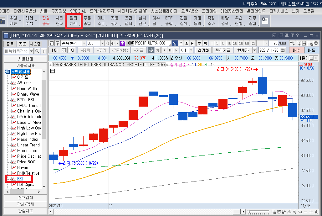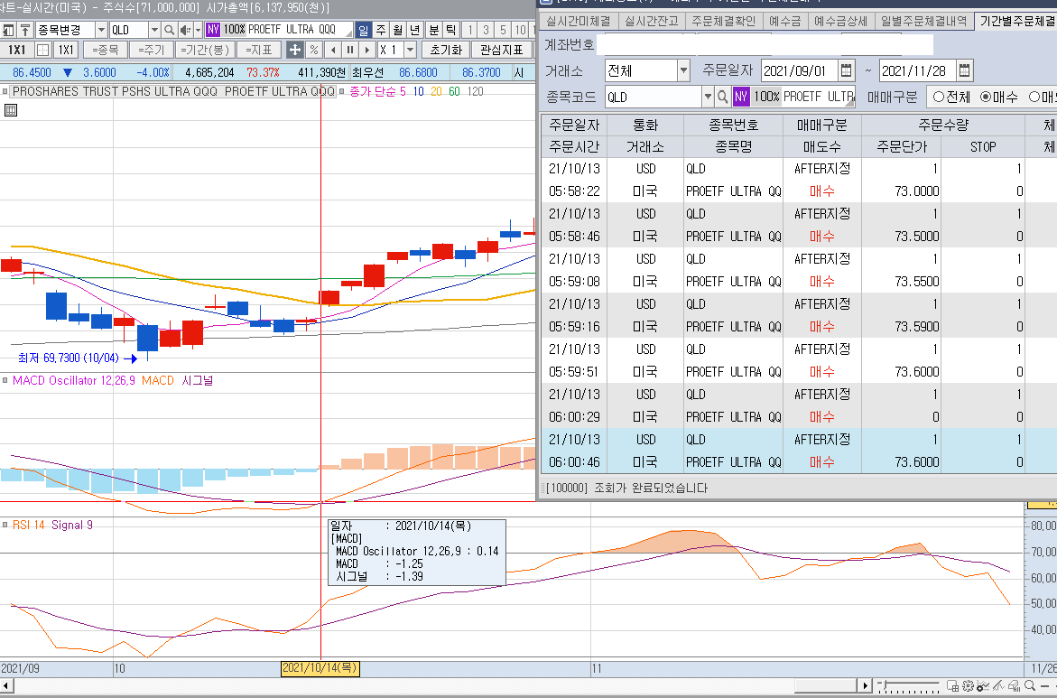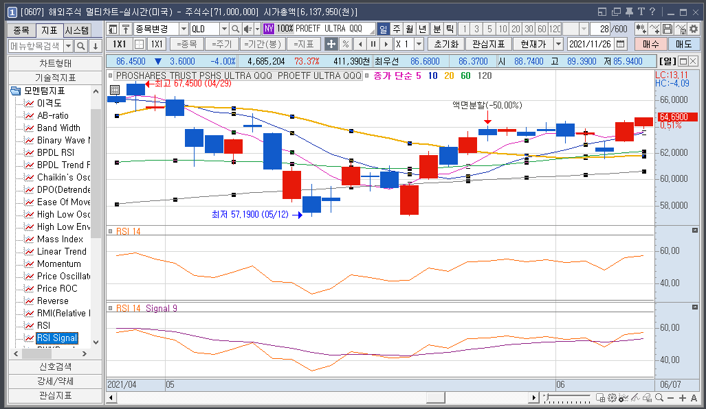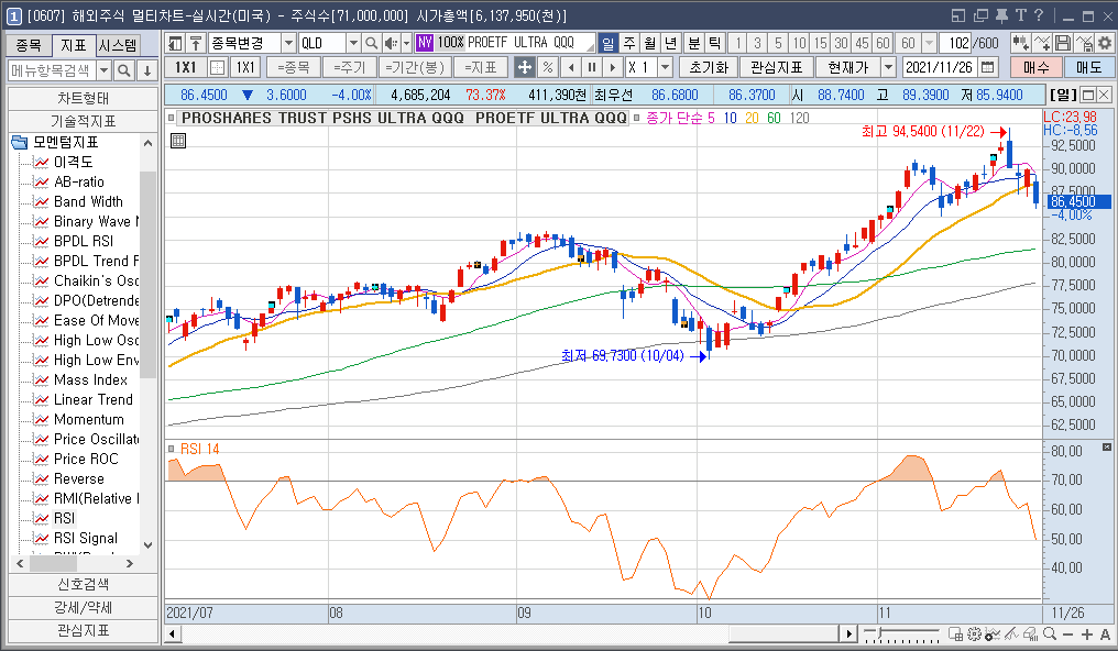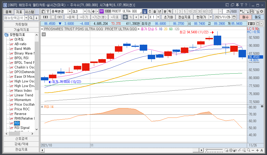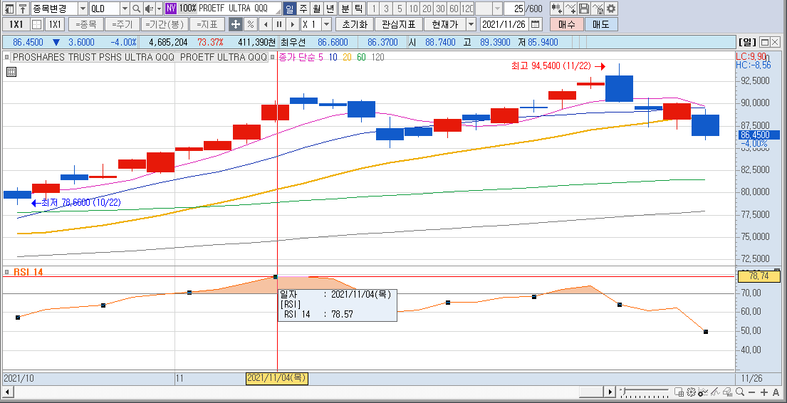 미국 레버리지 ETF인 QLD의 차트입니다. RSI 14 차트를 보면 2021년 11월 04일 RSI 14가 78.57 입니다.