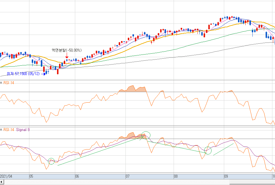 RSI 14 Signal 9 라고 되어 있으며 이는 RSI 14 중 9일간의 값을 지수평균의 방법으로 구한 이동평균선을 시그널(선)으로 표시한 겁니다.