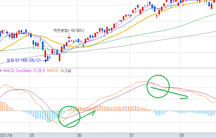 MACD선과 시그널선의 교차 기울기가 커질 수록 신뢰도가 높습니다.