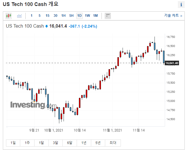 2021년 11월 26일 다양한 이유(코로나 변이, 재확산등)로 나스닥 선물 지수가 약 2.24% 하락 했습니다.