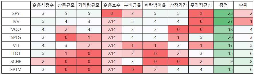 | 추종지수 | CRSP U.S. Total Market | S&P Total Market Index | Dow Jones US Broad Stock Market | S&P Composite 1500 |