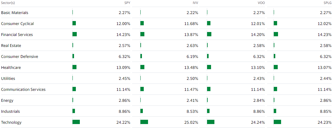 SPY, IVV, VOO, SPLG 는 같은 지수를 사용하기 때문에 섹터의 구성이나 비중이 거의 비슷합니다.
