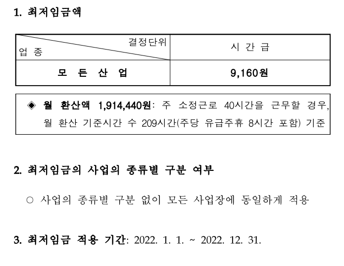 ■ 2022년 부터 모든 산업의 시간급(최저임금)은 9,160원 입니다.