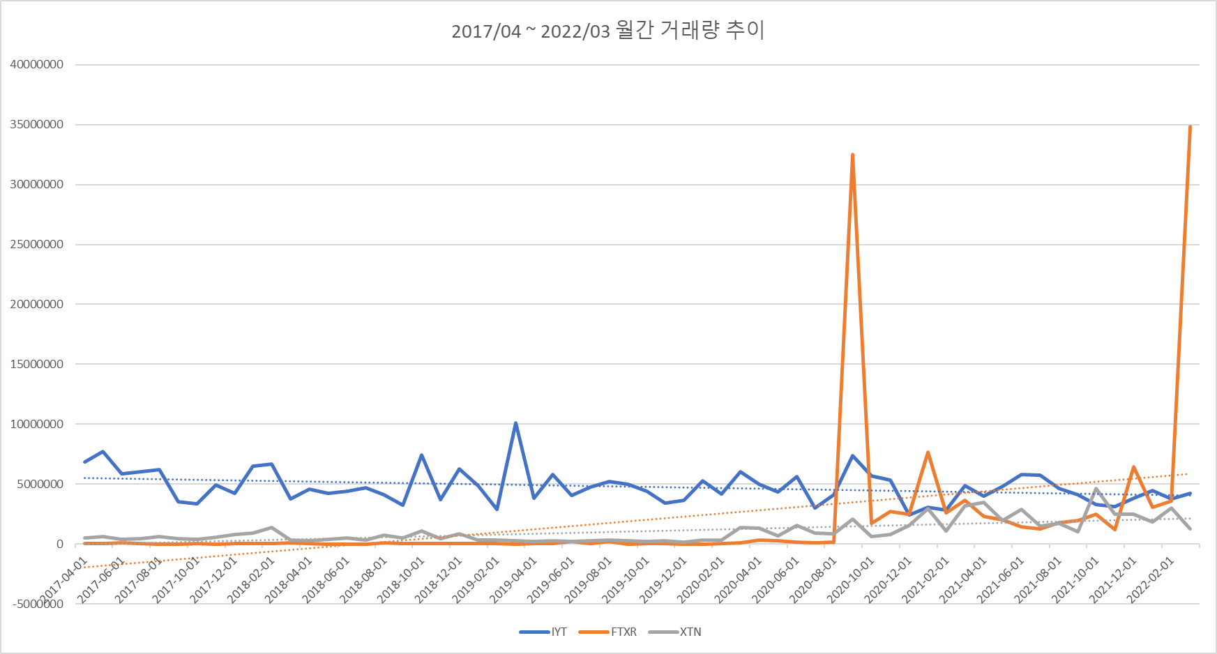 2017 ~ 2022년 약 5년간의 월간 거래량 추이 입니다. FTXR이 폭발적인 거래량을 보이는 구간이 있으며, IYT는 아무래도 상장기간이 길다보니 FTXR이나 XTN보다 기본 거래량이 동기간에 봤을때 있는 편입니다.