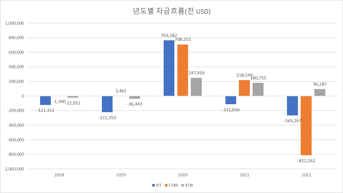 하지만, 자금흐름을 보면 FTXR의 일달이 2022년 들어서 높은 편입니다. XTN 꾸준하게 유입이 되지만, 2020년 IYT, FTXR의 유입 규모에 비해 아주 적기 때문에 실제 유입된 자금으로만 보면 IYT가 좋은 편입니다.