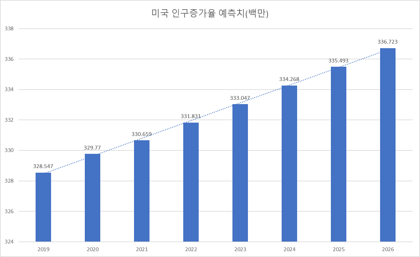 특히, IMF 보고서의 미국 인구증가율 전망을 보면 2026년 까지의 예측치만 봐도 인구가 꾸준하게 증가하기 때문에 소비시장도 계속 증가할 거라 판단 됩니다.