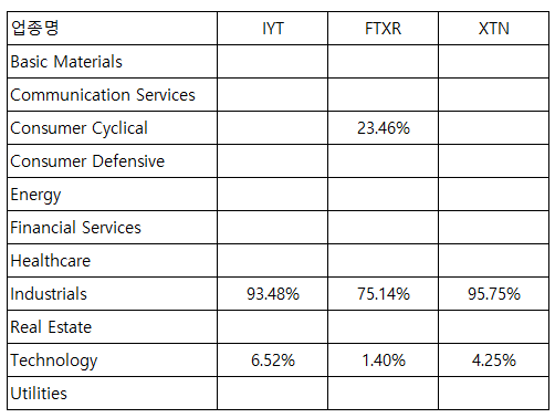 IYT, XTN은 비슷한 섹터분포를 보이고 있습니다.