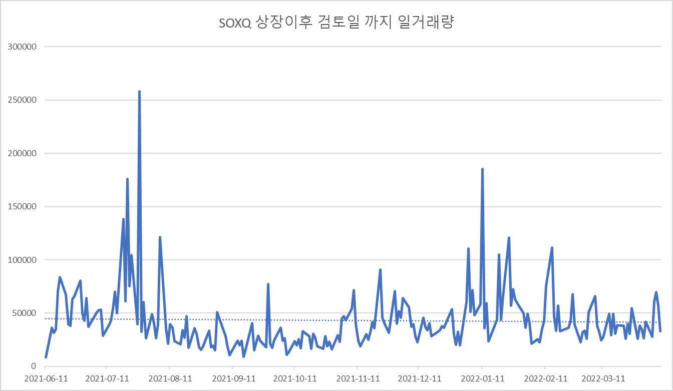 SOXQ의 상장이후 검토일 까지 일거래량은 그래도 평균적으로 약 4만건 유지를 하고 있습니다. 거래량은 조금 중요한 요소입니다.