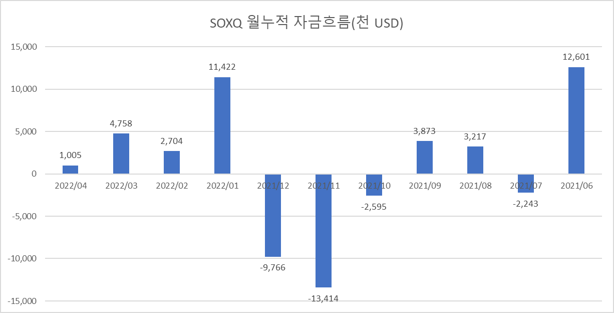 SOXQ의 상장이후 누적자금 흐름을 보면 2021년 11, 12월 많이 빠졌다가 2022년 들어서 다시 유입되고 있습니다.