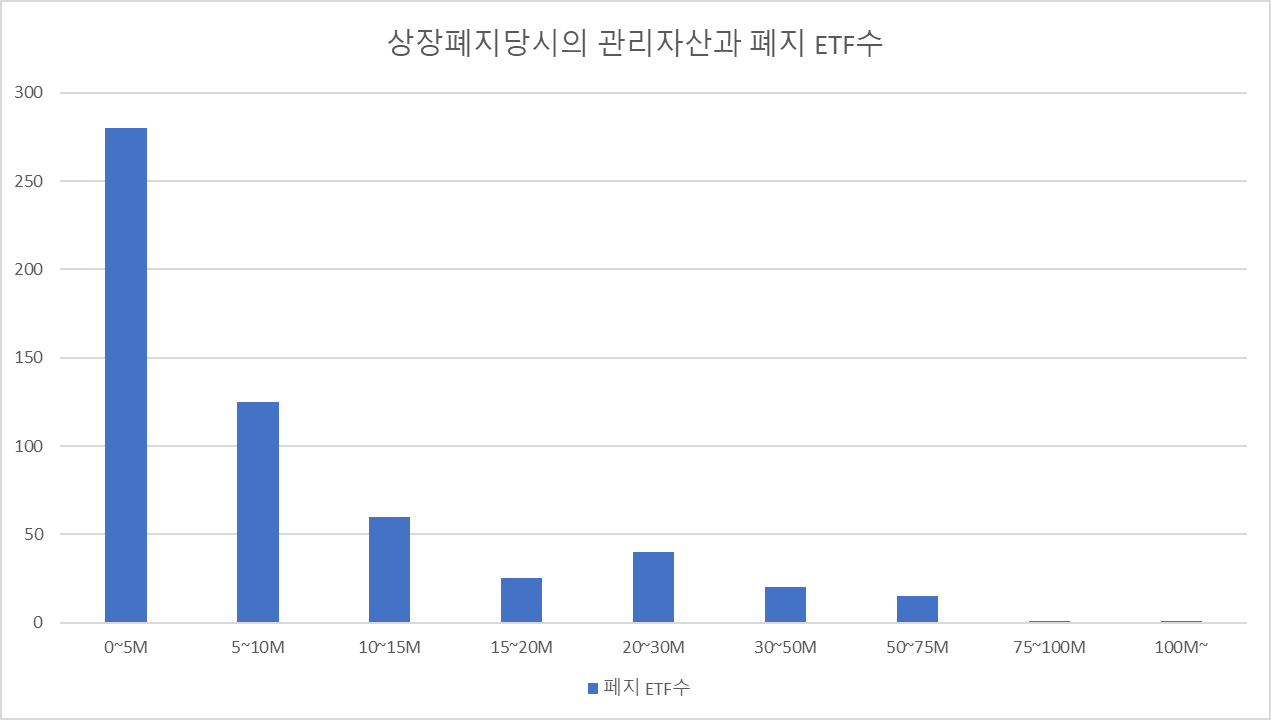 2013년~2018년 사이 폐지된 ETF들의 폐지당시 관리자산(AUM)을 보면 7,500만 달러 이하 상품들도 많이 상장폐지 된 걸 볼 수 있습니다.