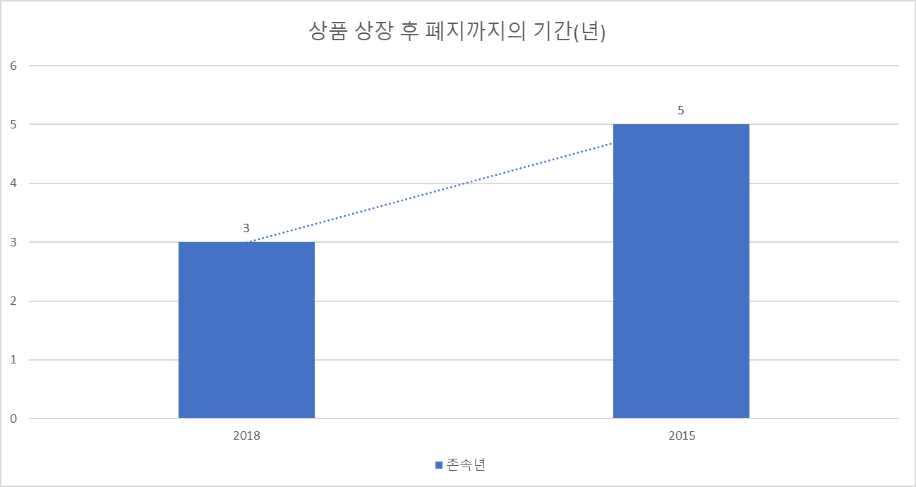 2015년 이전에는 상장 후 평균적으로 약 5년 정도 상품이 존속되었다면, 2018년에는 약 3년 정도의 존속기간을 가졌습니다. 약 3년안에 상품의 거래량, 관리자산등이 증가하지 않는 다면 조금 조심할 필요가 있으며, 관리자산 거래량이 적더라도 5년 이상 유지되고 있다면, 폐지율이 낮다는 말이 됩니다.