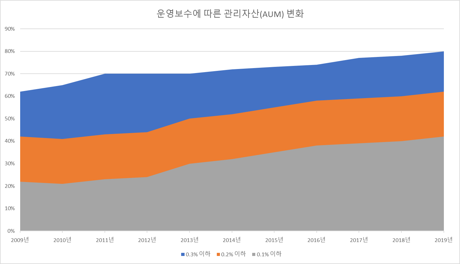 운영보수에 따른 관리자산(AUM) 증가율을 봐도 운영보수가 낮은 상품의 인기를 알 수 있습니다.