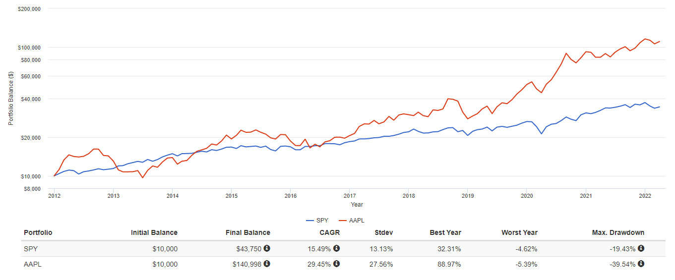 애플과 SPY의 10년 백테스트 입니다.