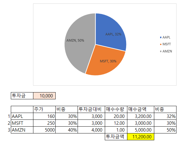 투자금 10,000달러는 애플, 마이크로소프트, 아마존에 각 30%, 30%, 40%로 분산 하려고 해도 주가가 높을 경우 제대로된 분산이 어렵습니다.