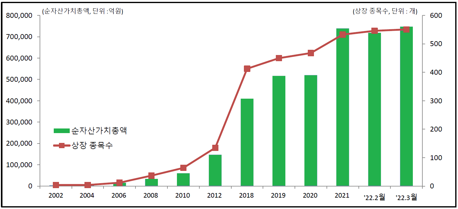 국내 ETF는 2002년 처음 출시가 되었으며, 2022년 운영사는 총 20개 입니다.
