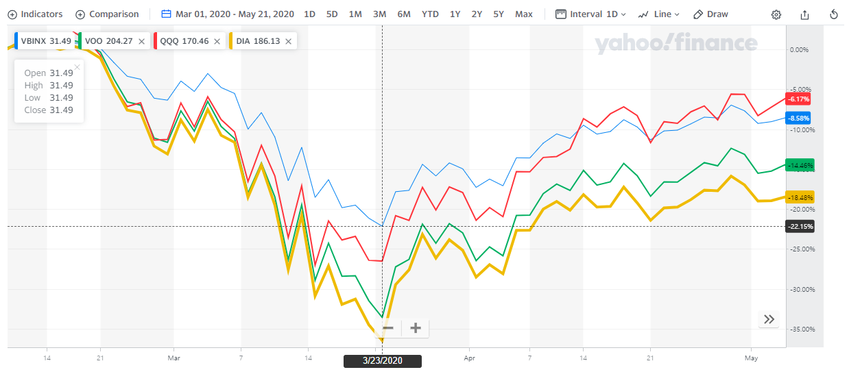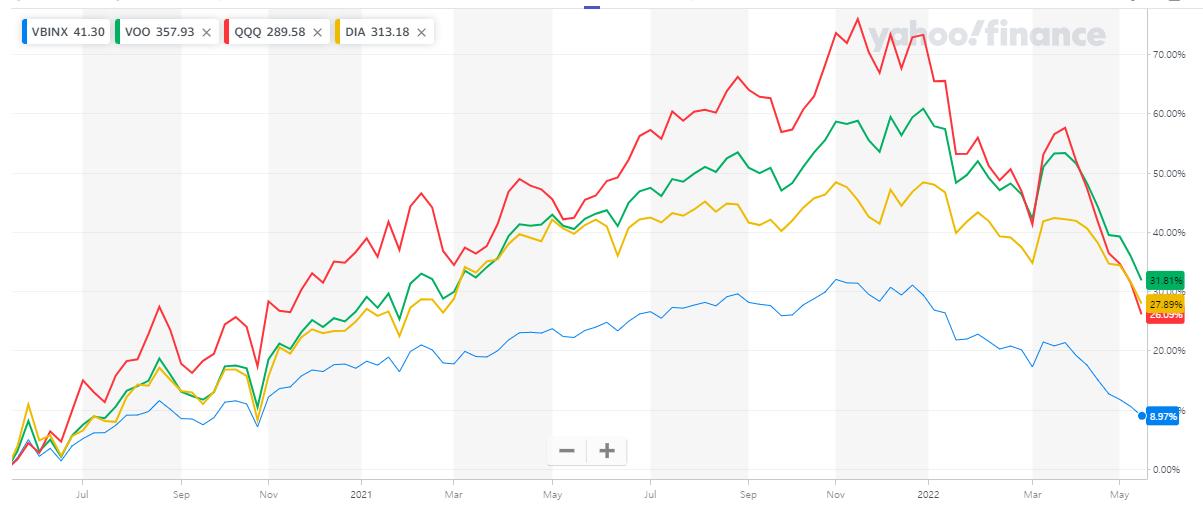 주식 60% / 채권 40%의 비중으로 구성된 밸런스드 인덱스 펀드 : VBINX는 3대 지수에 비해 과거 수익성은 좋지 못 하지만, 시장의 변동이 클때 적절한 방어를 해주며 혹시 매도가 필요할때 자산을 어느정도 지켜주는 역할을 충분하게 해줄 수 있습니다.