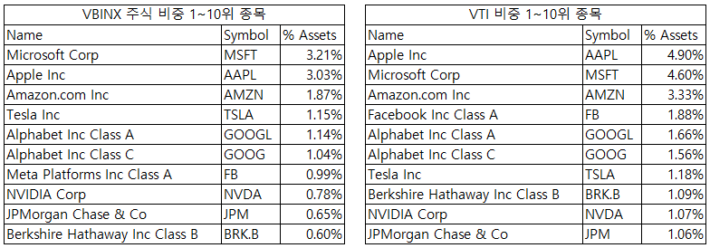 같은 지수를 사용하는 VTI와 BND로도 VBINX와 같은 역할을 할 수 있으며, 오히려 비중 조절이 용이하기 때문에 자산의 분배가 쉽습니다.