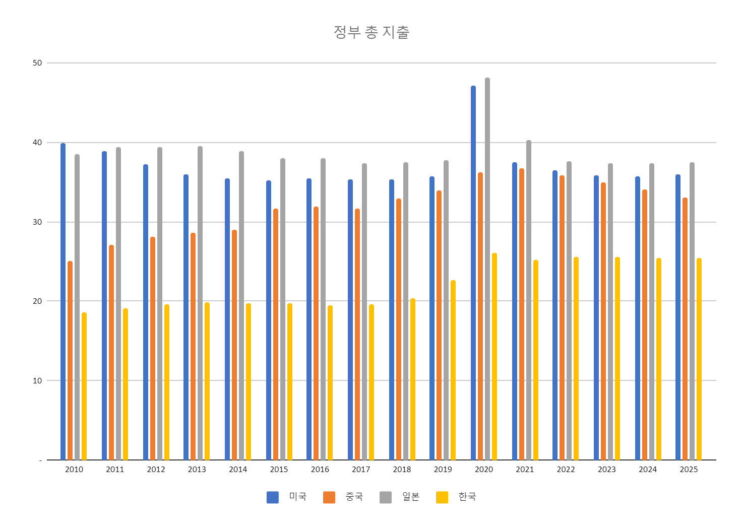 2020년 코로나로 인해 각국의 지출이 많이 늘어난 걸 볼 수 있습니다.
