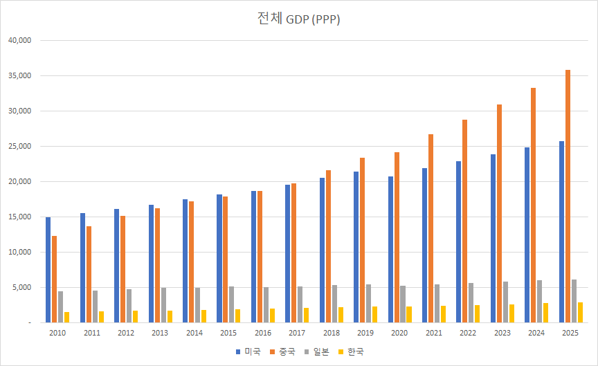 전체 GDP(PPP)는 중국은 이미 미국을 앞지르고 있습니다. 1인당으로 보면 낮지만 전체 규모는 중국이 상당히 큽니다.