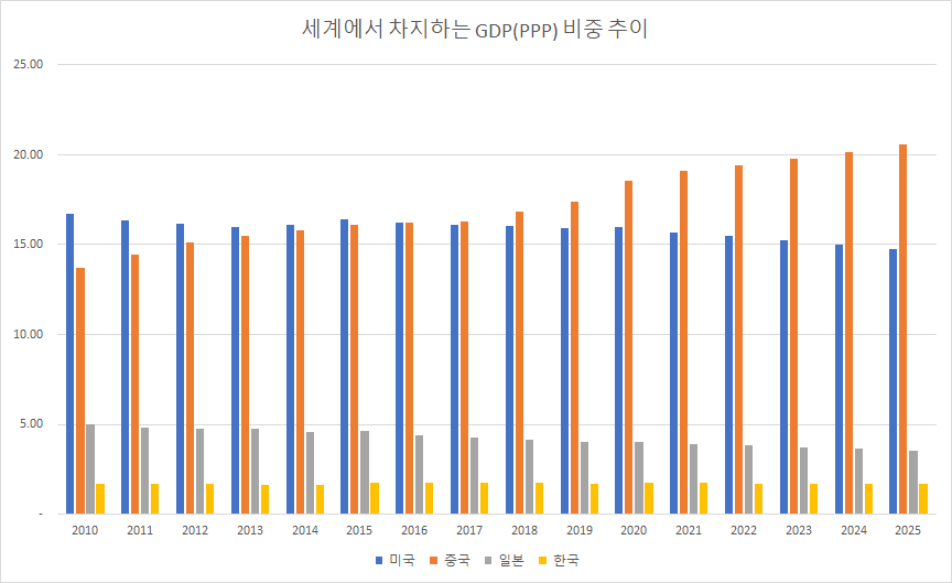세계에서 얼마나 GDP(PPP)가 큰 부분을 나타내는 비중추이 입니다. 미국은 2020년 이후로 감소세 이며, 중국은 증가세를 보이고 있습니다.