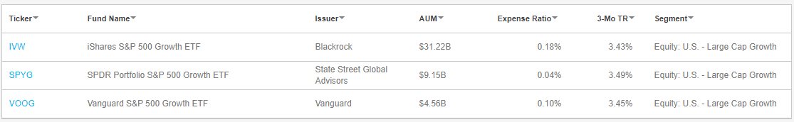 S&P 500 Growth 지수 추종 ETF 는 위와 같이 IVW, SPYG, VOOG 가 있습니다.