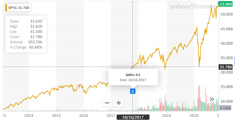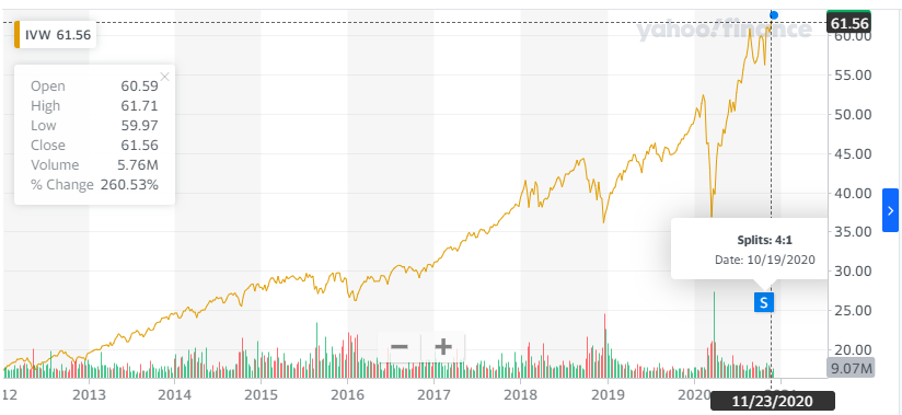 IVW도 2020년 10월 19일 4:1로 주식 분할을 했습니다.