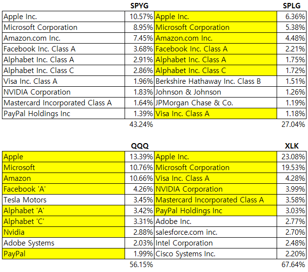 노랑색 바탕은 SPYG와 같은 종목입니다. QQQ가 상위 종목 중 SPYG와 같은 종목이 제일 많습니다.