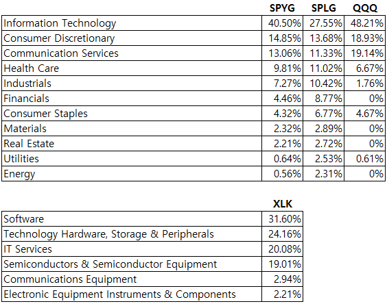XLK는 SPYG, SPLG, QQQ와 다른 섹터 구성을 가지고 있습니다.