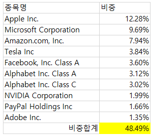 상위 종목들의 자산이 엄청나서 낮게 보이지만 미국에 상장된 전체 약 2,000개 ETF 중 상위 10% 들어가는 ETF 입니다.