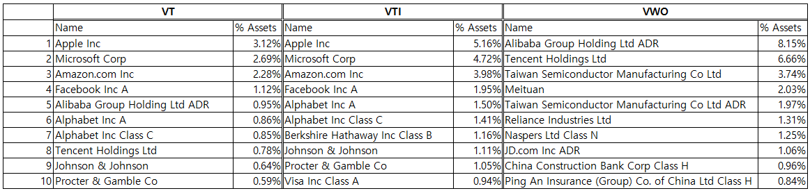 VT, VTI 는 대부분 미국의 빅테크가 주요 순위에 있으며, VWO는 중국과 대만의 기업이 순위권에 있습니다.