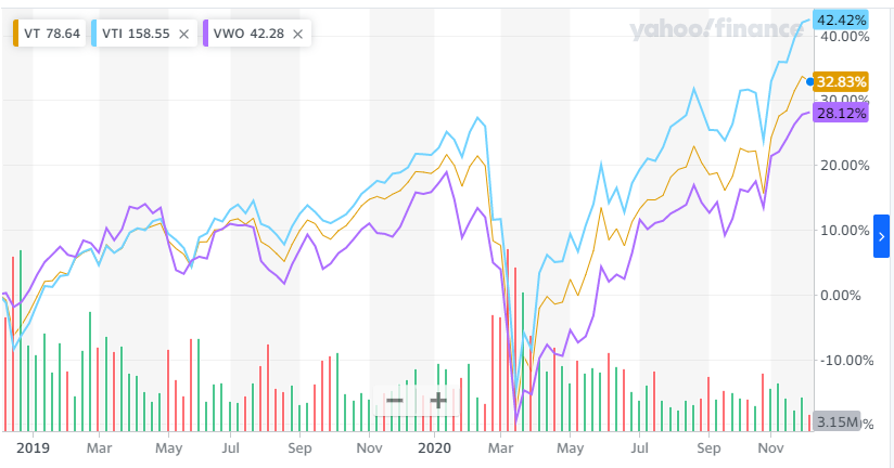 약 2년 정도의 주가 그래프로, 그래프 시작일로 부터 지금까지의 수익률 입니다. VTI는 약 42%, VT는 약 32%, VWO는 약 28% 수익률을 보였습니다.