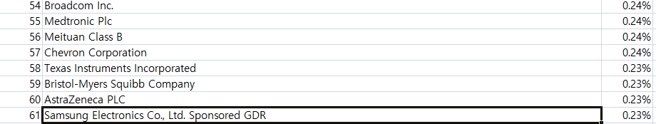삼성전자는 비중 약 0.23%로 중복무시하고 순차 순위적용시 약 61위에 위치해 있습니다.