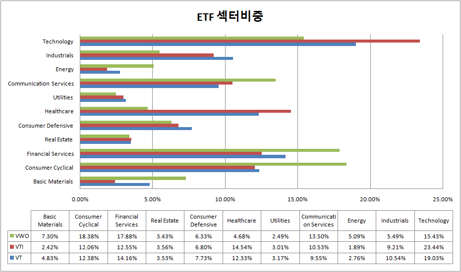 VTI는 VT, VWO에 비해 관리종목수가 적고 최근 좋은 성장을 보이는 기술산업 섹터가 높아 좋은 수익률을 보였습니다.