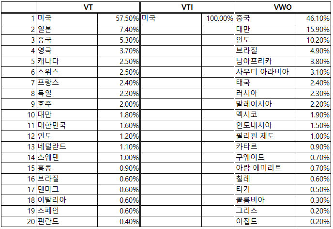 VT는 선진국의 비중이 높습니다. VTI는 미국의 시장 전체를 추종하며, VWO는 신흥국 위주입니다. 한국은 신흥국으로 간주하고 있지 않습니다.