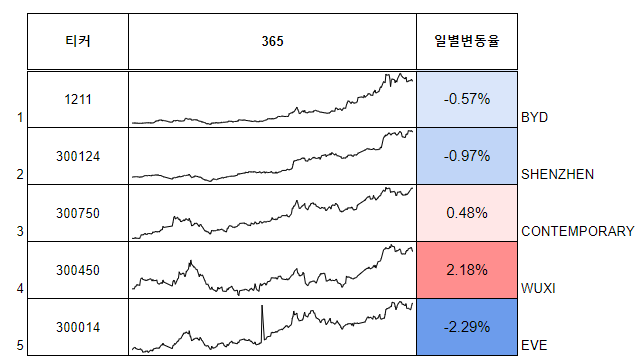 종목구성입니다. 샤오펑, 니오, 리오토는 포함되어 있지 않습니다.