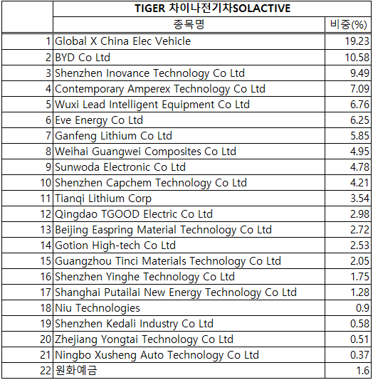 종목구성방식은 1) 전자제품 2) 자동차 3) OEM 자동차 부품 4) 산업용 기계 5) 특수화학 6) 특수 산업용 제품 7) 다각화 화학 섹터로 분류된 기업들을 시가총액 기준으로 각 섹터당 상위 8종목, 총 20종목까지 편입 되며, 비야디의 시가총액이 니오, 샤오펑, 리오토 보다 높습니다.