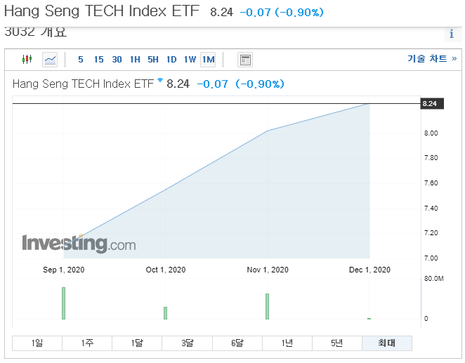 상장된지 얼마 안됐기 때문에 홍콩에 상장된 Hang Seng TECH Index ETF (3032)의 주가 변동율을 보겠습니다.