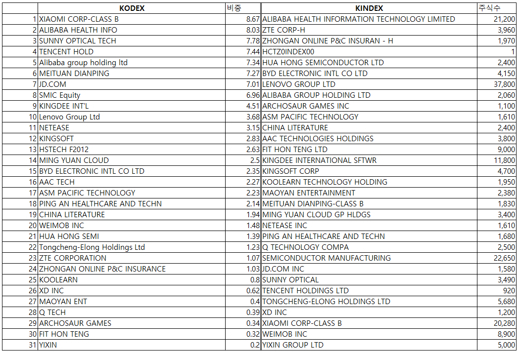 KINDEX(킨덱스) 차이나항셍테크 구성종목은 주식수로 해놔서 정확한 비중 산정이 어렵습니다. 하지만, KINDEX는 수수료도 높고 시총도 낮기 때문에 크게 다루지 않습니다.