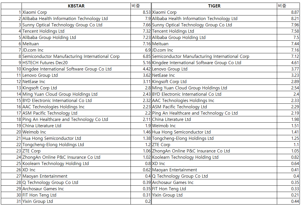 TIGER(타이거) 차이나항셍테크의 구성종목이 다른 두 ETF와 다릅니다. 종목수가 KODEX(코덱스) 차이나항셍테크, KBSTAR(케이비스타) 차이나항셍테크에 비해 1개 적습니다.