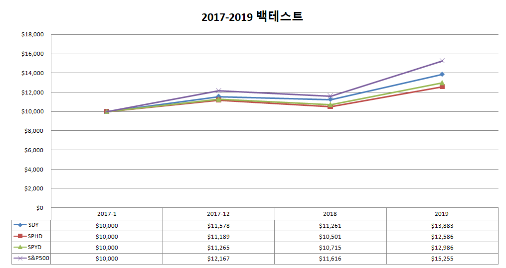2017-2019년 까지의 백테스트 입니다. 배당을 재투자하는 조건이며, SDY가 SPYD, SPHD 보다 좋은 모습을 보여 줬습니다.