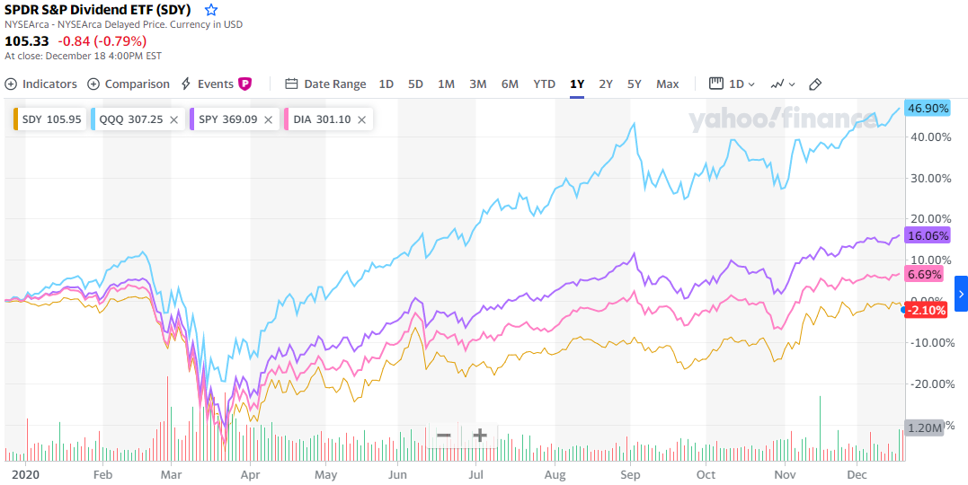 주요 지수와 단순 1년 주가만 비교하면 SDY는 아직 전고점을 회복하지 못 했습니다.