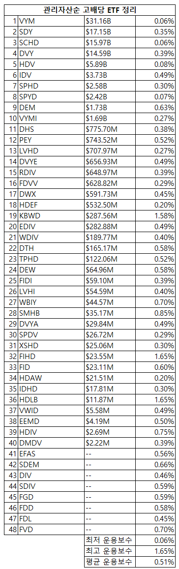 고배당으로 분류되는 ETF는 약 48개 정도가 있으며, 고배당 ETF들의 평균 운용비용은 약 0.51% 입니다.